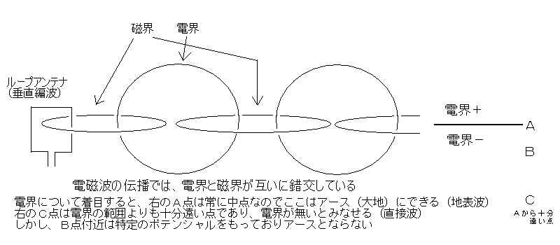 電界の中点は常に0Vですから、ここ(下図A点)に大地(アース)があると良好に伝播できます(地表波)
