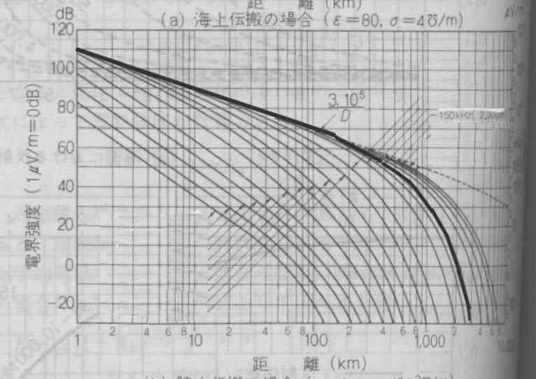 太線が150kHzの電波伝搬の実測値です。(電気通信学会 電気通信ハンドブックより引用)