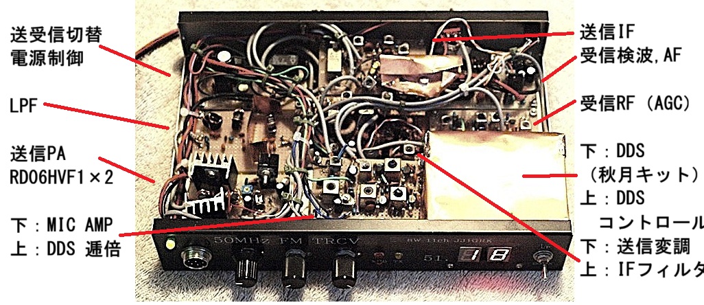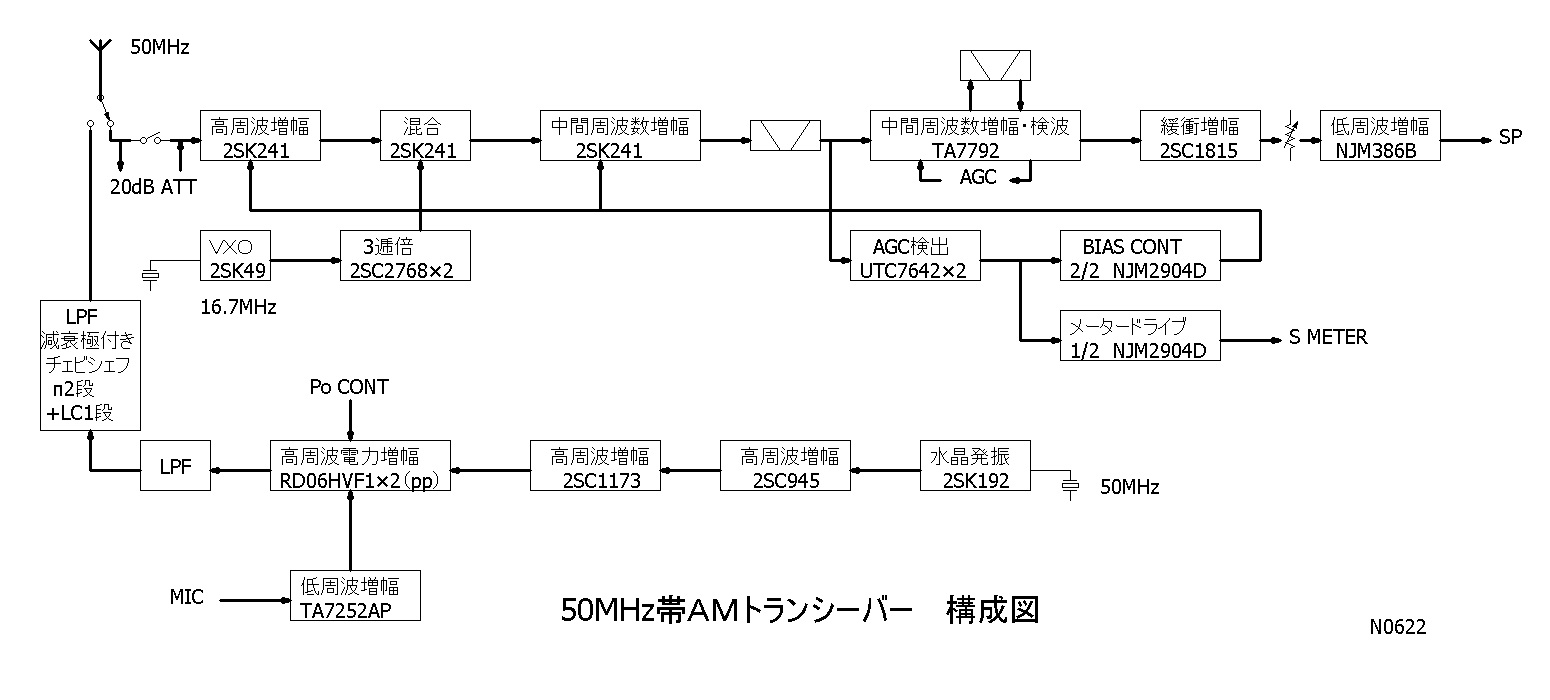 これは50MHz帯のAMトランシーバー。送信3ch、受信はVXO連続可変。出力は5Wです。